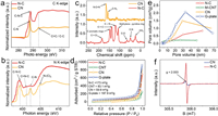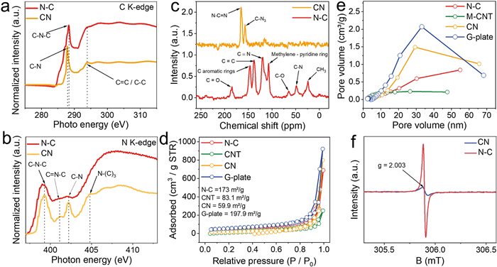| Fig. 3. (a) C and (b) N K-edge NEXAFS of N–C and CN. (c) Solid 13C NMR results for CN and N–C. (d) N2 adsorption and desorption isotherms and (e) pore size distributions for N–C, CNT, CN and G-plate. (f) Solid EPR spectra for CN and N–C. | |