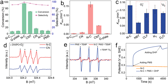 | Fig. 4. Performance evaluation. (a) Conversion and selectivity for CN, N–C, M-CNT, N–C(CA+U) and G-plate in selective oxidation of 1,4-DHP. (b) Kinetic rate constant of selective oxidation of 1,4-DHP (25 ppm) with various carbon catalyst in the PMS system. (c) Trapping experiments with different scavengers in PMS activation for oxidation of 1,4-DHP using N–C as the catalyst. Reaction conditions: [Catalysts]0 = 5mg/L, [1,4-DHP]0 = 25 mg/L, [PMS]0 = 0.2 mmol/L, [CLF]0 = 20 mmol/L, [NBT]0 = 1 mmol/L. EPR measurements for monitoring (d) O2•− (DMPO) and (e) 1O2 (TEMP) in PMS activation process for the oxidation of 1,4-DHP. (f) Open-circuit potential curves on N–C electrode in PMS mediated oxidation system. | |