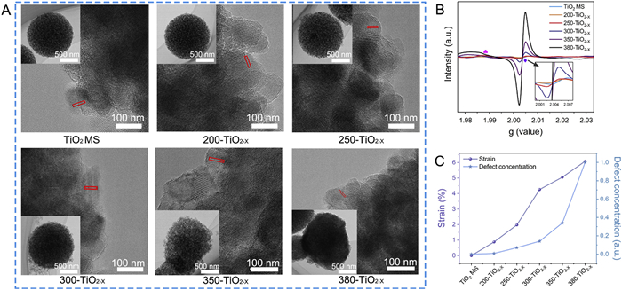 | Fig. 1. (A) TEM images of the as-prepared TiO2 MS and the TiO2−X MS obtained at different reduction temperatures (inset: HRTEM images). (B) EPR spectra of the TiO2/TiO2−X MS (diamond: g = 2.003, club: g = 1.988). (C) Variation of the lattice strain measured by TEM (left y axis) and the normalized defect concentration measured by EPR (right y axis) with the reduction temperature. | |