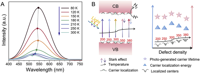 The advantages of defects include improved light absorption and enhanced carrier separation resulting from local effects. Because light absorption is enhanced with increasing defect density, the influence of the defect density on photocatalytic efficiency was explored by analyzing the change in the localized defect density. Temperature-dependent PL spectra for TiO2 MS, 300-TiO2–X MS, 380-TiO2–X MS are shown in Fig. 4A and Fig. S23 (Supporting information), and the variation of the emission peak energy positions with increasing temperature for the reduced TiO2–X MS was found to be significantly different from that for the as-prepared TiO2 MS. In the case of the TiO2 MS, the emission peak energy position showed a slight shift phenomenon, while the reduced 300-TiO2−X samples displayed a more obvious abnormal V-shaped behavior of blue-shift after obvious red-shift of PL peak position. For a typical compound semiconductor, the PL peak position exhibits a red shift with increasing temperature as expressed by Varshni’s equation [49]: