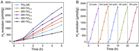 | Fig. 2. (A) Comparison of the hydrogen evolution rates of the photocatalysts under simulated sunlight. (B) Recycling runs of 300-TiO2−X for photocatalytic hydrogen generation. | |