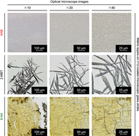 | Fig. 2. Comparison of the matrix crystal morphologies of AAB, 2-MBT, and 9-AA coated on ITO conductive glass slides. An Olympus BX53 microscope (Tokyo, Japan) was used for microscopic images acquired under 10×, 20×, and 40× magnification. | |
