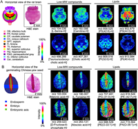 | Fig. 3. The selected ion maps of metabolites detected from rat brain (A) and germinating Chinese yew (Taxus chinensis var. mairei) seed (B) tissue sections by MALDI-TOF/TOF MS in negative ion mode using AAB as the matrix. The H&E-stained image was obtained from the same tissue section after MSI. MS imaging was acquired at 200 µm and 100 µm spatial resolutions, respectively. | |