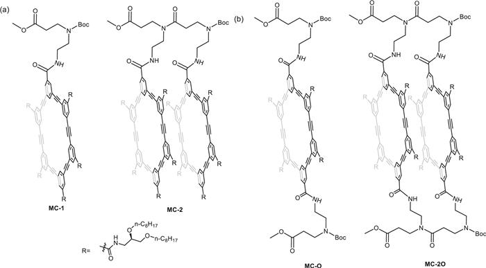 | Fig. 1. Structures of (a) Single-stranded macrocyclic monomer MC-1 and dimer MC-2, (b) double-stranded monomer MC-O and dimer MC-2O. | |