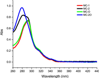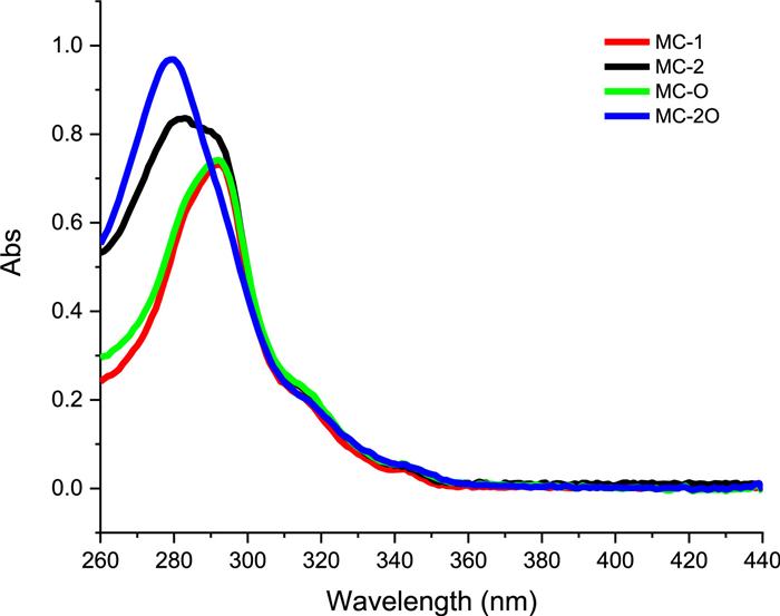 | Fig. 2. Absorption spectra of MC-1, MC-2, MC-O and MC-2O (solvent, CCl4; concentration of each compound, 10 µmol/L; light path, 4 mm; 25 ℃). | |