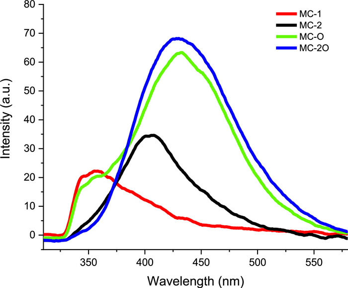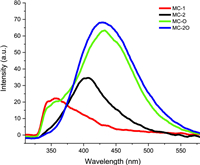 | Fig. 3. Emission spectra of MC-1, MC-2, MC-O and MC-2O in CCl4 (concentration of each compound, 5 µmol/L; excitation wavelength, 295 nm; light path, 1 cm; 25 ℃). | |