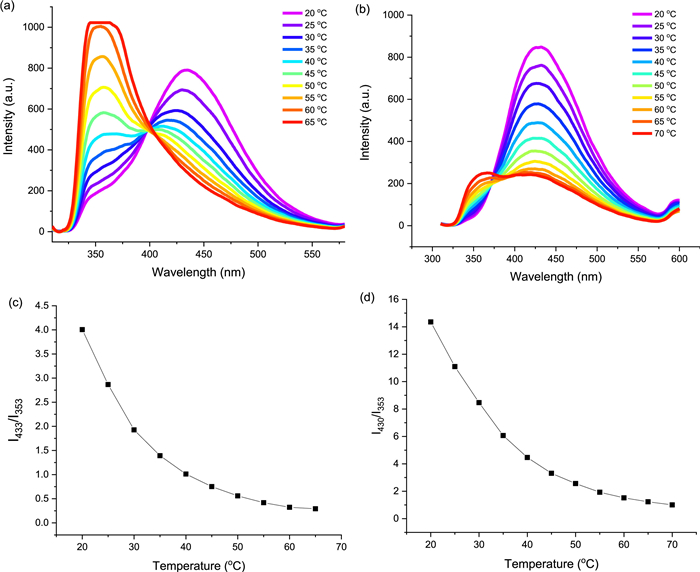 | Fig. 4. Temperature-dependent fluorescence spectra of (a) MC-O and (b) MC-2O in CCl4 (~5 µmol/L). Plot of (c) I433/I350 (MC-O) and (d) I430/I350 (MC-2O) against temperature. | |