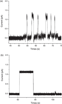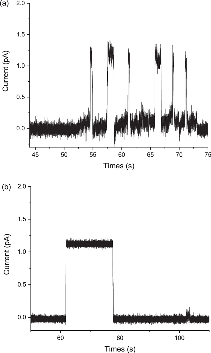 | Fig. 6. Current traces of single-channel recording in a planar lipid bilayer with (a) MC-O and (b) MC-2O at 200 mV in HCl (2.0 mmol/L, 20 ℃). | |