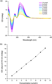| Fig. 5. (a) CD spectra of MC-2O in CCl4. (b) The CD intensity (at 313 nm) of MC-2O in CCl4 varies with concentration at 25 ℃ (light path, 4 mm). | |