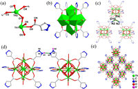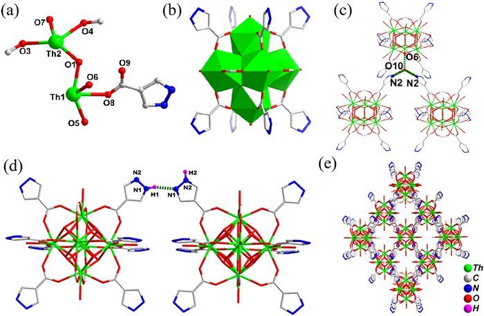 | Fig. 1. (a) Asymmetric unit of compound 1. (b) The structure of Th6(µ3-O)4(µ3-OH)4(H2O)6(HPyC)8(HCOO)4 cluster. (c, d) Hydrogen bond interactions forces between adjacent Th6 clusters. (e) 3D porous structure of compound 1 formed by hydrogen bonding. Color scheme: Th, green; Cu, cyan; C, gray; O, red; N, blue; H, pink. Most H atoms were omitted for clarity. | |