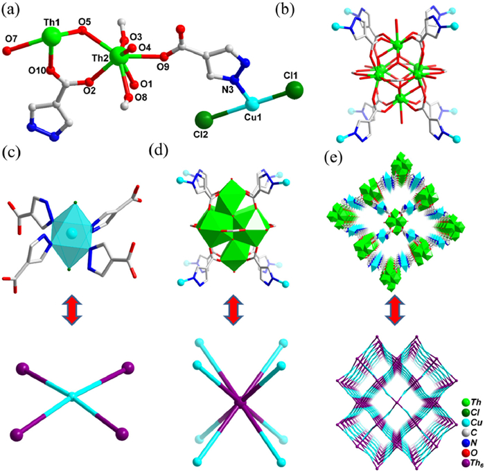 | Fig. 2. (a) Asymmetric unit of compound 2. (b) The Th6(HPyC)8 cluster connected with eight Cu atoms. (c) The Copper ion connected to four pyrazoles and viewed as a 4-connected node. (d) Th6 cluster connected to eight copper ions and viewed as an 8-connected node. (e) 3D framework of compound 2 is classified as a (4,8)-connected scu net. Color scheme: Th, green; Cu, cyan; Cl, dark green; C, gray; O, red; N, blue; Th6, purple. H atoms were omitted for clarity. | |