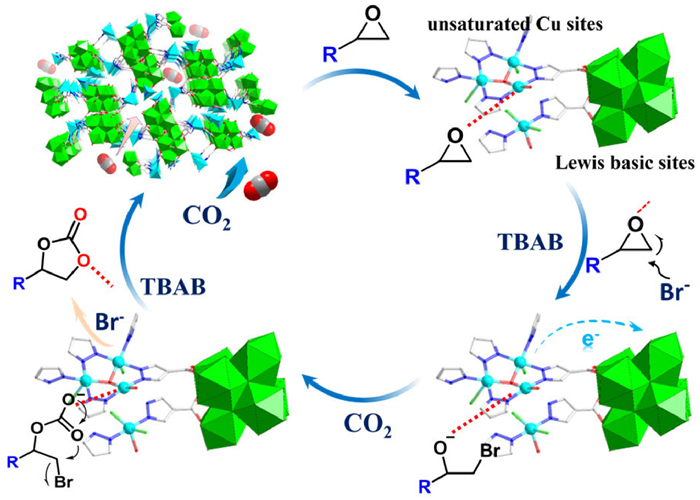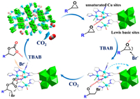 Combined with the structural characteristics of catalysts and literature reports, the possible mechanism of cycloaddition reaction is proposed [44,45], as shown in Fig. 4. Epoxides and CO2 molecules are first attracted and enriched into the pore structure by hydrogen bonding and weak interactions. The oxygen atoms on the epoxide are then activated by forming coordination bonds with the unsaturated metal site copper ions, thereby weakening the C—O bonds in epoxides. Then, the nucleophilic Br− anion of the cocatalyst TBAB attacks the carbon atoms with small steric hindrance on the epoxy ring, thereby opening the epoxy ring to form intermediate oxygen anions. Simultaneously, Th6 clusters can provide Lewis acidic and defect sites for catalytic reactions and facilitate the transfer of electrons [27,46–48]. Polarized CO2 rapidly combines with oxygen anions to form five-membered cyclic carbonate anions. Finally, Br− is removed from the alky-carbonate anions, and the cocatalyst TBAB is released to complete the cyclization process. From this catalytic process, the heterometallic unsaturated metal site copper cation and the Lewis basic site Th6 cluster synergistically drive the catalytic reaction.
