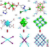 Heterometallic multi-component MOFs constructed based on clusters are gaining increasing attention due to their richer structural diversity and multifunctionality compared to the single-component MOFs [35–37]. A reasonable method for the synthesis of heterometallic MOFs is employing polyfunctional hybrid ligands or mixed ligands with varied coordination capabilities instead of polycarboxylic acid ligands, which is also suitable for the constructing of heterometallic ThCOFs. For example, Luo et al. used a multifunctional imidazole acid derivative ligand to combine 5f and 3d metal to obtain a [Th8Co8] nanocage MOF with double screening ability, which can be used for clear separations of both H2/D2 isotopes and butane/or hexane isomers [38]. Hu and coauthors reported a viologen-based radical-containing heteroaromatic MOF with an unprecedented (6, 18)-connected she-d topology. This multicomponent MOF exhibits excellent visible/NIR light-driven CO2 photoreduction activity [39].