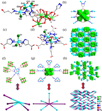 | Fig. 3. (a) Asymmetric unit of compound 4. (b) Th6(HPyC)7 cluster connected with ten Cu atoms. (c) The structure of trinuclear cluster Cu3(µ3-OH)(HPyC)5. (d) The coordination modes of Cu1 ion. (e) 3D framework of compound 4. (f) Cu3 cluster connected with five Th6 clusters and viewed as a 5-connected node. (g) Th6 cluster connected to five Cu3 clusters and two Th6 clusters and viewed as a 7-connected node. (h) The topology of compound 4 is classified as a (5,7)-connected net. Color scheme: Th, green; Cu, cyan; Cl, dark green; C, gray; O, red; N, blue; Th6, purple. H atoms were omitted for clarity. | |