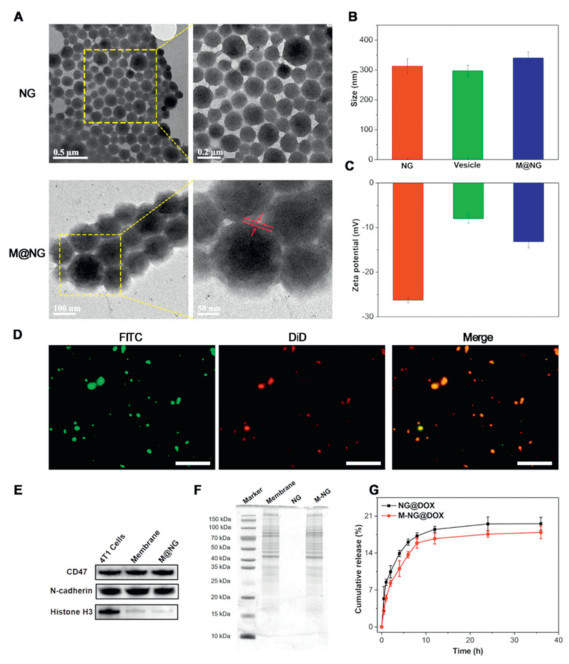 | Fig. 1. Characterizations of M-NG. (A) TEM images of NG and M-NG morphologies. (B) DLS data for NG and M-NG (n = 3). (C) Zeta potential values associated with NG and M-NG (n = 3). (D) Inverted fluorescence microscope images of M-NG, highlighting the co-localization between gelatin NG (FITC, green) and 4T1 cell membranes (DiD, red). Scale bar: 10 µm. (E) Assessment of CD47, N-cadherin, and histone H3 proteins in 4T1 cells, 4T1 cell membrane vesicles, and M-NG using WB. (F) SDS-PAGE protein profiles for 4T1 cell membrane, NG, and M-NG. (G) Observation of cumulative DOX release patterns from NG@DOX and M-NG@DOX at pH 7.4 and 37 ℃ in vitro (n = 3). Values were noted as the mean ± standard deviation (SD). | |