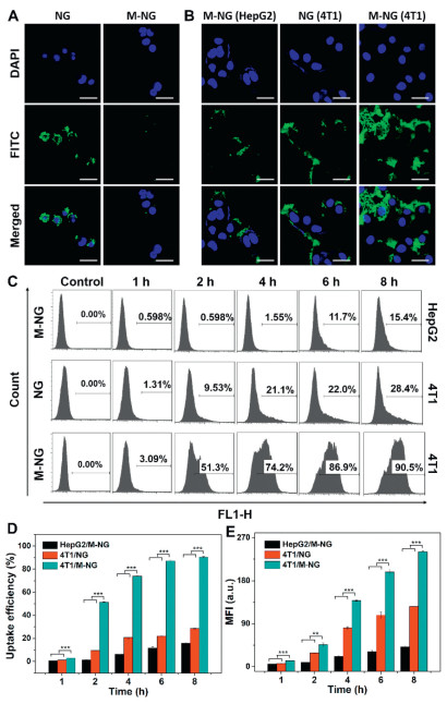 | Fig. 2. Assessment of phagocytosis of M-NG by macrophages and the evaluation of homologous targeted uptake of M-NG in vitro. (A) Uptake by RAW264.7 of FITC-labeled NG and M-NG following a 4-hour incubation period. Scale bar: 30 µm. (B) Comparative cellular uptake: M-NG in HepG2 cells, NG in 4T1 cells, and M-NG in 4T1 cells, visualized using CLSM. Scale bar: 30 µm. (C) Flow cytometry analysis of the cellular uptake against various cells lines with corresponding cellular uptake efficiency (D) and mean fluorescence intensity (MFI) values (E) qualified (n = 3). **P < 0.01, *** P < 0.001. Values were noted as the mean ± SD. | |