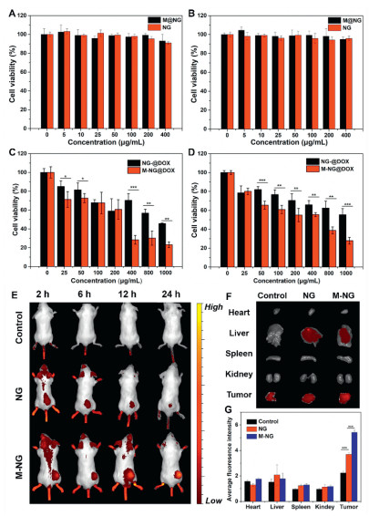 When analyzing the in vitro drug release patterns of NG@DOX and M-NG@DOX in PBS (pH 7.4) at 37 ℃, it was observed that about 19.56% ± 1.21% of the drug was released from NG@DOX over 36 h (Fig. 1G). In contrast, roughly 17.90% ± 1.20% was released from M-NG@DOX. The slightly reduced drug release from M-NG@DOX can be associated with its diminished permeability, a consequence of the outer cell membrane coating on gelatin NG. Additionally, this membrane camouflage likely moderates the abrupt release tendencies of the drug-loaded platform.