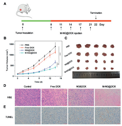| Fig. 4. Illustration of the antitumor efficacy of M-NG@DOX in vivo. (A) Schematic representation of the study's timeline. (B) Growth curves of xenograft tumors in mice (n = 5). Values were noted as the mean ± SD. ** P < 0.01, *** P < 0.001. (C) Representative images of xenograft tumors across different experimental groups. (D) H&E and (E) TUNEL stained sections of tumor tissues post a 14-day treatment duration. Scale bar: 100 µm. | |