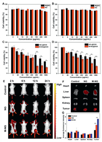 | Fig. 3. Evaluation of the in vitro antitumor efficacy and in vivo biodistribution of M-NG. (A) Viability of HC11 cells post a 24-h incubation with NG and M-NG (n = 3). (B) Viability of 4T1 cells following a 24-h incubation with NG and M-NG (n = 3). Viability of 4T1 cells post treatment with NG or M-NG for durations of 24 h (C) and 48 h (D) (n = 3). (E) Visual representation of the biodistribution of free Cy-7, Cy-7-NG or Cy-7-M-NG in the whole body. (F) Ex vivo imaging of major organs and tumors at 24 h post-injection with comparative fluorescence intensity of Cy-7 across major organs and tumors. (G) Quantitative analysis of average fluorescence imaging signals in vivo (n = 3). * P < 0.5, ** P < 0.01, *** P < 0.001. Values were noted as the mean ± SD. | |
