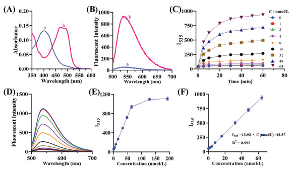 | Fig. 1. (A) Absorption and (B) fluorescence emission spectra of Ce-OHOA (10 µmol/L) before (a) and after (b) reaction with β-lactamase (64 nmol/L) at 25 ℃ for 30 min in PBS (pH 7.4). λex = 480 nm. (C) Plots of fluorescence intensity I535. The reaction time of Ce-OHOA (10 µmol/L) with varied concentrations of β-lactamase (0–64 nmol/L). λex = 480 nm. (D) Fluorescence emission spectra of Ce-OHOA (10 µmol/L) with 0–192 nmol/L β-lactamase. (E) Fluorescence intensity I535 of Ce-OHOA (10 µmol/L) with 0–192 nmol/L β-lactamase. (F) Linear fitting curve of fluorescence intensity I535 toward the concentration of β-lactamase (0–64 nmol/L). λex = 480 nm. | |
