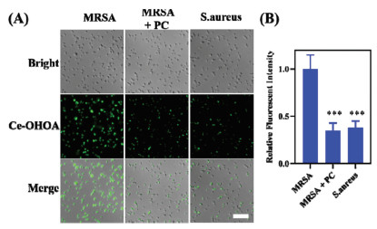 | Fig. 2. (A) Confocal fluorescence images of MRSA, MRSA+PC and S. aureus (non-expressing β-lactamase) incubated with Ce-OHOA (10 µmol/L). Scale bar: 20 µm. (B) Relative pixel intensity of the corresponding fluorescence images in pane A. ***P < 0.001 vs. MRSA group. Error bars: mean ± standard deviation (SD) (n = 10). | |