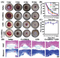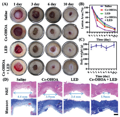 After demonstrating the favorable biocompatibility of Ce-OHOA with normal skin, we conducted additional photodynamic antimicrobial validation using a rat wound infection model (Adherence to the ethical standards set by the Animal Ethics Committee at Wenzhou Medical University was ensured, approval number: Wydw7019–0134). As depicted in Figs. 4A and B, the rate of wound healing was slower in the saline, saline + LED, and Ce-OHOA groups when compared to the Ce-OHOA + LED group. On day 10, the infected wound form the Ce-OHOA + LED group only slight marks, while all other control groups showed varying degrees of unrepaired wounds. Under the irradiation of the 500 nm LED, the rats did not show any recurrence of the wound or signs of septic infection. Moreover, the body weight of rat fluctuated within the normal range during the treatment (Fig. 4C), indicating that Ce-OHOA accelerates the healing of infected wounds through antibacterial photodynamic therapy.