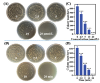 | Fig. 3. Digital images of clonogenic assay performed in plates, with clones produced by MRSA under different concentrations (A) or different illumination times (B). (C, D) Colony numbers are counted using Image J. All the data are presented as mean ± SD (n = 3). ***P < 0.001 vs. control group. | |