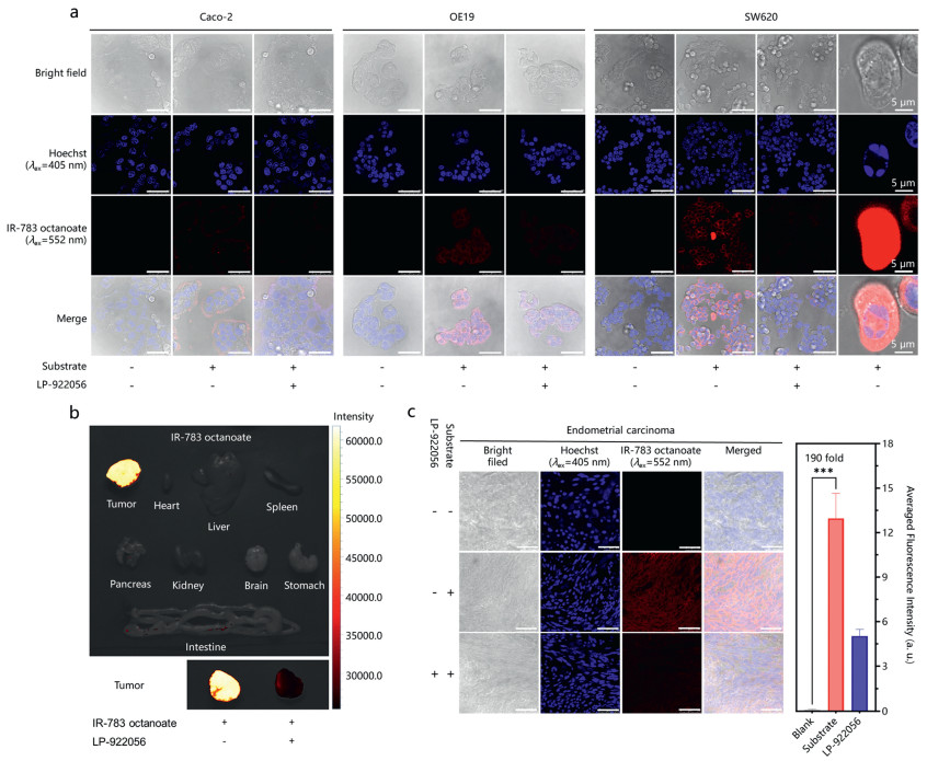 Finally, the hNotum activity in human endometrial carcinoma tissues are visualized using IR-783 octanoate as a fluorogenic tool. Previously studies have reported aberrant Wnt signaling in endometrial carcinoma [64-66], while genomics data also suggest high expression levels of hNotum in endometrial carcinoma [67-69]. As shown in Fig. 4c, upon addition of IR-783 octanoate in human endometrial carcinoma tissue slices for 30 min, brightly red fluorescence signals were observed, with an average enhancement of 190-fold. Upon addition of LP-922056, the red fluorescence signals were significantly decreased, suggesting that the red fluorescence signals were triggered mainly by hNotum in these cancerous tissues. These observations suggested that IR-783 octanoate could serve as a practical fluorogenic tool for hNotum-associated clinical carcinoma diagnosis and pathological investigations.