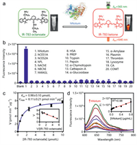 | Fig. 3. (a) The mechanism of IR-783 octanoate as hNotum optical substrates. (b) Specificity of IR-783 octanoate to hNotum, P < 0.0001. (c) The Michael-Menten curve and the Eadie-Hoftsee plot of Notum-mediated IR-783 octanoate hydrolysis. (d) Liner response between fluorescence signals of IR-783 octanoate and the hNotum concentrations. Error bars represent mean ± standard deviation (SD). | |