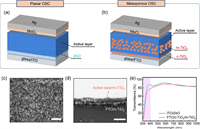 | Fig. 2. (a) Chemical formula of materials used in this work: PBDB-T, PM6, L8-BO, BTP-4Cl, IT4F, TPDIC, and as-DCPIC. (b) Energy levels diagrams for different layers in the mesoporous OSCs. (c) The dark current densities for mesoporous and planar type BHJ/SCOSCs. J-V characteristics for (d) as-DCPIC-based P-/M-SCOSCs and PM6:L8-BO-based P-/M-OSCs. (e) The comparison of PCEs for P-/M-OSCs with different photoactive layers. | |