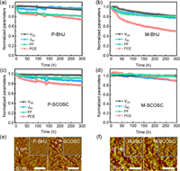 | Fig. 3. The photovoltaic parameters change of the encapsulated (a, b) BHJ-OSCs and (c, d) SCOSCs with mesoporous or planar structures based on PM6:L8-BO or as-DCPIC under continuous LED illumination (in an N2 filled glovebox). (e, f) The height AFM images for PM6:L8-BO and as-DCPIC layers in P- and M-OSCs. Scale bar: 1 µm. The inserts are the phase images. | |