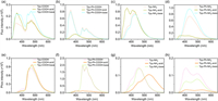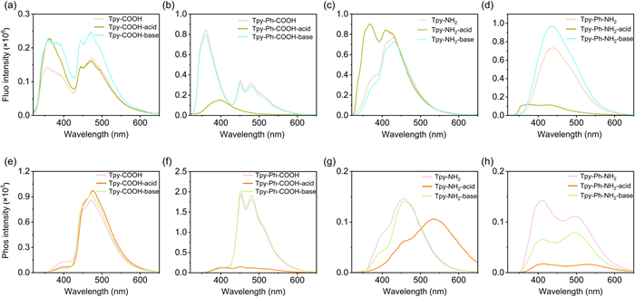 | Fig. 2. (a-d) Prompt emission spectra of PVA-Tpy-COOH, PVA-Tpy-Ph—COOH, PVA-Tpy-NH2, and PVA-Tpy-Ph—NH2 before and after acid-treatment and base-treatment, respectively (λex = 254 nm, 50 molar equivalents of HCl and NaOH were used, c = 1.0 mol/L). (e-h) Delayed emission spectra of PVA-Tpy-COOH, PVA-Tpy-Ph—COOH, PVA-Tpy-NH2, and PVA-Tpy-Ph—NH2 before and after acid-treatment and base-treatment, respectively (λex = 254 nm, 50 molar equivalents of HCl and NaOH were used, c = 1.0 mol/L). | |