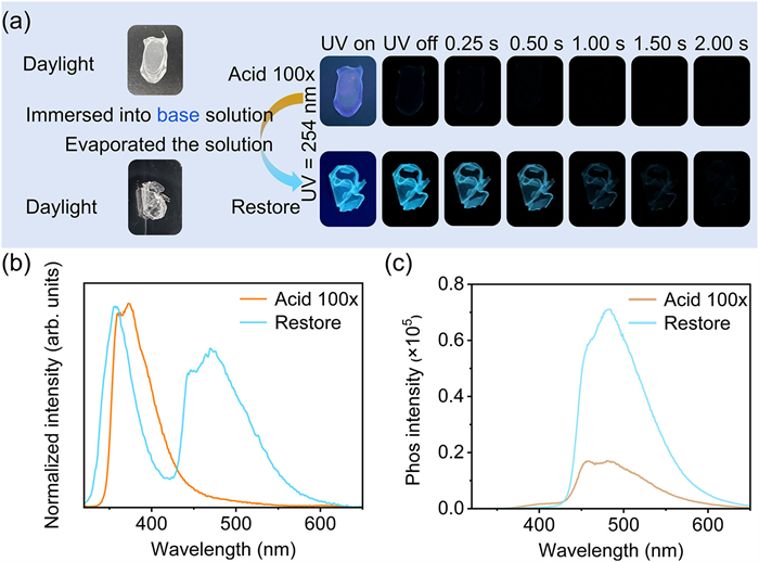 | Fig. 4. The illustration of RTP recovery of acid-treated PVA-Tpy-COOH films by the addition of base. (a) Photographs of acid-treated and restored PVA-Tpy-COOH films under daylight, 254 nm UV excitation and at different time intervals after the removal of UV irradiation. (b, c) Prompt and delayed emission spectra of acid-treated and restored PVA-Tpy-COOH films. | |