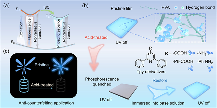 In this study, we present a feasible method for achieving pH-responsive RTP materials by integrating poly(vinyl alcohol) (PVA) with carboxylic acid or amino group functionalized terpyridine (Tpy) derivatives (Scheme 1). Wherein the carboxylic acid and amino groups act as both hydrogen bond donor and acceptor for enhancing hydrogen bonding interactions between organic phosphors and PVA. For one, the heteroatoms of these Tpy derivatives are beneficial to enhancing spin−orbit coupling (SOC) between excited singlet and triplet states [12]. For another, the Tpy unit provides an excellent platform for realizing pH-responsiveness owing to its reversible protonation and deprotonation upon exposure to acid and base, respectively. As our expected, the RTP properties of these Tpy derivatives-based films exhibit a significant degradation upon exposure to acid due to the protonation of Tpy units. On the contrary, the lifetimes of RTP films reveal a slight prolongation when exposed to base solution. Based on the decent RTP performance and pH-responsiveness of these Tpy derivatives-based films, a spatial-time-resolved anti-counterfeiting application is demonstrated with greatly enhanced security level.