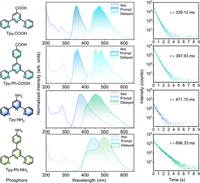 | Fig. 1. The molecular structures of organic phosphors (Tpy-COOH, Tpy-Ph—COOH, Tpy-NH2, and Tpy-Ph—NH2), and UV absorbance, prompt and delayed-steady photoluminescence spectra and time-resolved emission-decay profiles of corresponding RTP films (λex = 254 nm, c = 0.1 wt%). | |
