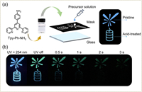 | Fig. 5. The spatial-time-resolved anti-counterfeiting application. (a) The schematic illustration of designing and fabricating anti-counterfeiting by using pristine and acid-treated PVA-Tpy-Ph—NH2 precursor solutions as paints. (b) Photographs of the anti-counterfeiting pattern under 254 nm UV excitation and at different time intervals after the removal of UV irradiation. | |
