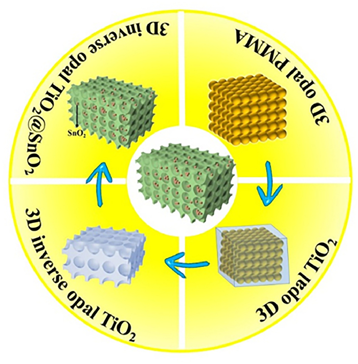 TiO2 has higher strength, negligible volume change and can provide a certain reversible capacity in the charging-discharging process, which is considered an ideal alternative material as the nanoconfinement materials [24–26]. In recent years, porous TiO2 has been applied as framework materials for LIBs [27,28]. This special structure is interconnected, allowing electrons and ions to diffuse through adjacent pores, promoting electrolyte infiltration and improving electrical conductivity. For example, Liang et al. synthesized inverse opal TiO2-X/Sulfur composite as Li-S cathode, which achieved long cycling life and high capacity [29]. Therefore, if it is used as the nanoconfinement material for SnO2, not only the volume expansion problem can be effectively solved, but also the electrochemical kinetics of the electrode can be improved.