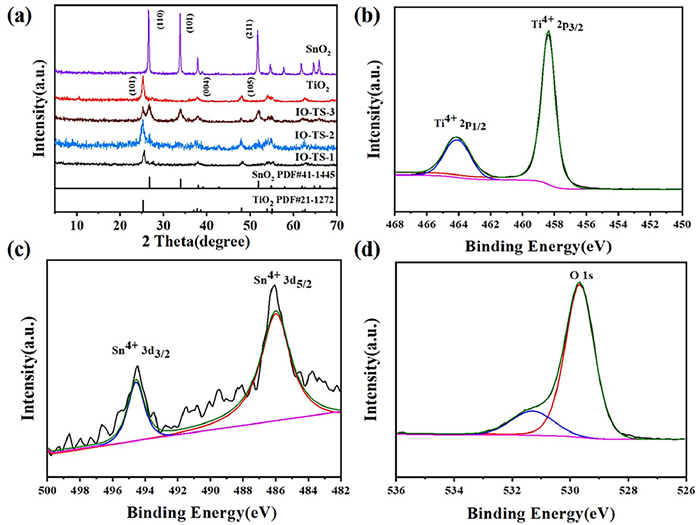 | Fig. 2. XRD patterns of (a) IO-TiO2, SnO2, IO-TS-1, IO-TS-2 and IO-TS-3. The corresponding high-resolution XPS spectra of (b) Ti 2p, (c) Sn 3d and (d) O 1s of IO-TS-2. | |