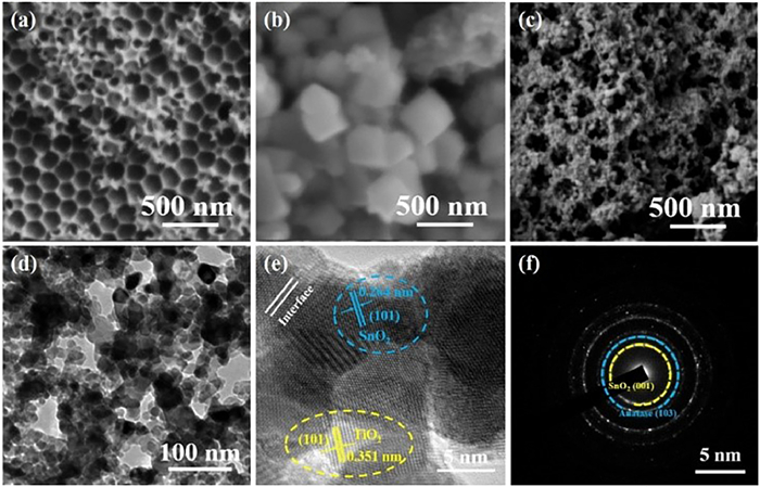 | Fig. 3. SEM images of (a) IO-TiO2, (b) SnO2, (c) IO-TS-2, (d) TEM image, (e) HRTEM image and (f) SAED pattern of IO-TS-2. | |