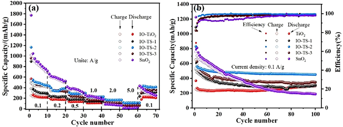 | Fig. 4. The rate performances (a) of IO-TiO2 IO-TS-1, IO-TS-2 and IO-TS-3 and SnO2, cycling performances (b) of IO-TiO2, IO-TS-1, IO-TS-2 IO-TS-3 and SnO2 at 0.1 A/g. | |