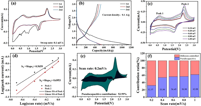 k1v and k2v respectively correspond to the current contribution of pseudocapacity and nested processes. Figs. 6e and f show the pseudocapacity ratio at 0.2 mV/s and the pseudocapacity ratio by running speed. Pseudocapacitance brings a huge capacity contribution at all scan rates, and the ratio of pseudocapacitance at the sweep speed of 0.2, 0.4, 0.6, 0.8 and 1.0 mV/s can reach 32.37%, 53.99%, 56.45%, 56.90% and 62.08% respectively (Fig. 6d). With it, as the scan rate increases, pseudocapacitance can occupy a leading position in the process, thereby storing Li+. Pseudocapacity formed on the surface of the material cannot access the high current of the fast discharge process in such a short time.