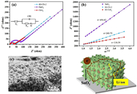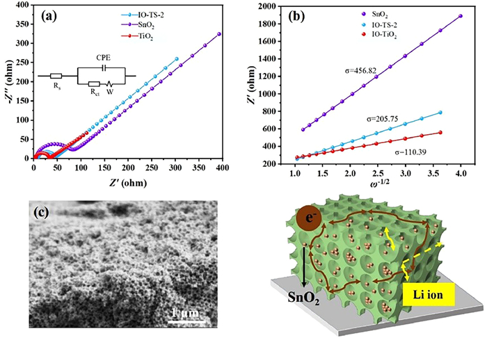 | Fig. 7. (a) EIS measurements after cycling of IO-TiO2, IO-TS-2 and SnO2. (b) The slope of the plots of Z' against ω−1/2 of IO-TiO2, IO-TS-2 and SnO2. (c) Schematic diagram of fast charge transfer and Li+ diffusion. | |