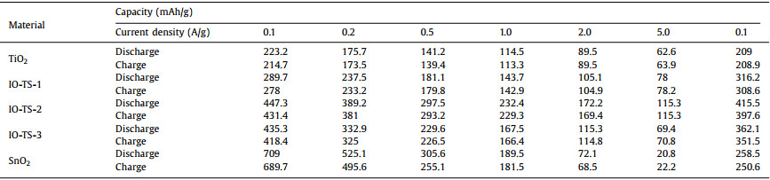 The electrochemical performances of IO-TiO2, IO-TS and SnO2 are shown in Fig. 4. SnO2 displays the higher capacity with poor rate performance while IO-TiO2 exhibits lower capacity with excellent rate capability (Fig. 4a). When IO-TiO2 was combined with SnO2, the rate capability was enhanced. However, with the increase of the addition of SnO2 contents, the capacity decreases, which is due to the higher SnO2 contents block the porous structure IO-TiO2, leading to the inefficient Li+ transfer (Fig. 4a). Details of electrochemical performances for all samples can be seen in Table 1.