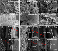| Fig. 5. The microtopography photographs of IO-TiO2, SnO2 and IO-TS-2 electrodes (a, e and i) before and (b, f and j) after cycling. The cross sections of the IO-TiO2, SnO2 and IO-TS-2 electrodes (c, g and k) before and (d, h and l) after cycling. | |
