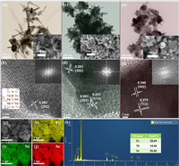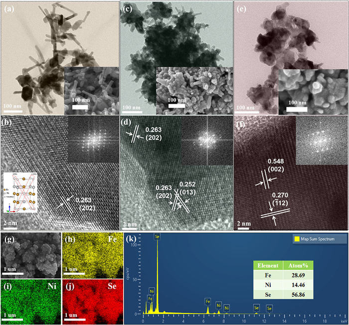 | Fig. 2. Typical TEM and HRTEM images of NiFe2Se4 nanostructures, the inset is the corresponding SEM and FFT result. (a, b) nano-rods, (c, d) nano-cactus with rod-like features growing on the surface, (e, f) nano-platelets. (g-k) The SEM elemental mapping and EDS of Fe, Ni, and Se for nano-platelets. | |