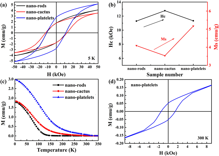 | Fig. 3. The magnetic properties of samples. (a) The M-H curve under the 5 K. (b) The corresponding HC and MS values of the various samples at 5 K. (c) The M-T curve and (d) the M-H curve of nano-platelets, under the 300 K. | |