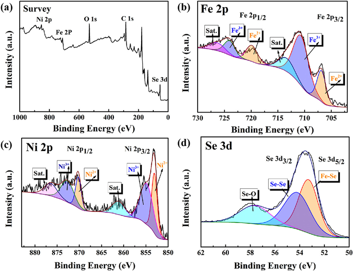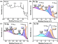 | Fig. 4. (a) XPS survey spectra of NiFe2Se4 sample (nano-platelets). High-resolution spectra of (b) Fe 2p, (c) Ni 2p, (d) Se 3d. | |