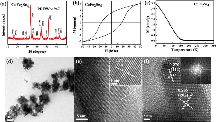| Fig. 5. (a) XRD patterns, (b) M-H curve under the 5 K, (c) M-T curve, (d-f) TEM and HRTEM of CoFe2Se4. | |