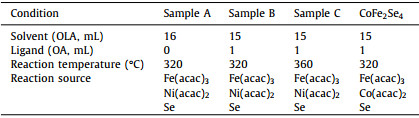A series of MFe2Se4 (M: Ni, Co) nanostructures were synthesized by a simple one-pot high-temperature organic-solution phase method. During this typical synthesis, first, stoichiometric metal source and Se were mixed in solvent OLA and ligand OA in the 100 mL round-bottomed four-necked flask equipped with a thermometer. Then, the unit was heated to 120 ℃ slowly and kept for 30 min to remove dissolved oxygen and low boiling solvent under the inert gas flow. Finally, at a ramping rate of 2 ℃/min, the solution temperature was raised to a specific temperature, and the reaction mixture was maintained for 60 min at this temperature for the reaction. After that, the solution was naturally cooled to room temperature by removing the heating source. The NiFe2Se4 and CoFe2Se4 nanostructures were repeatedly precipitated and washed by adding 20 mL of hexane and 10 mL of ethanol alternately and recentrifuging at 8000 rpm for 6 min. The samples of NiFe2Se4 with different reaction conditions were labeled as Sample A, Sample B, and Sample C, respectively. The specific synthesis morphology and corresponding reaction conditions are shown in Table 1.