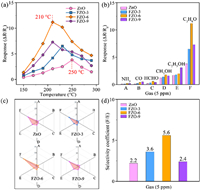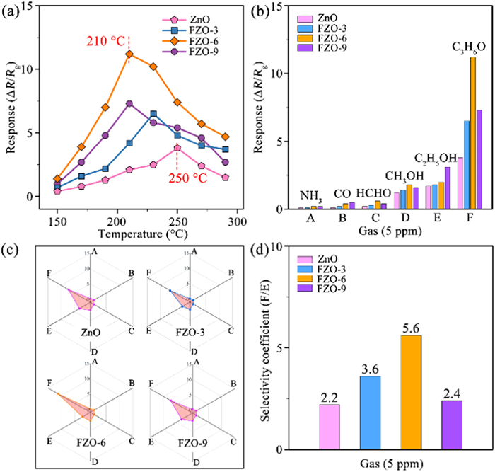 | Fig. 3. (a) Response values to 5 ppm acetone at different working temperatures, (b) selectivity tests to 5 ppm different gases, (c) radar plots transformed from selectivity bar charts, and (d) selectivity coefficient summary of ZnO, FZO-3, FZO-6 and FZO-9 based MEMS sensors. (The default working temperature was 250 ℃ for ZnO, 230 ℃ for FZO-3, 210 ℃ for FZO-6 and FZO-9. The default humidity was 30% RH). | |